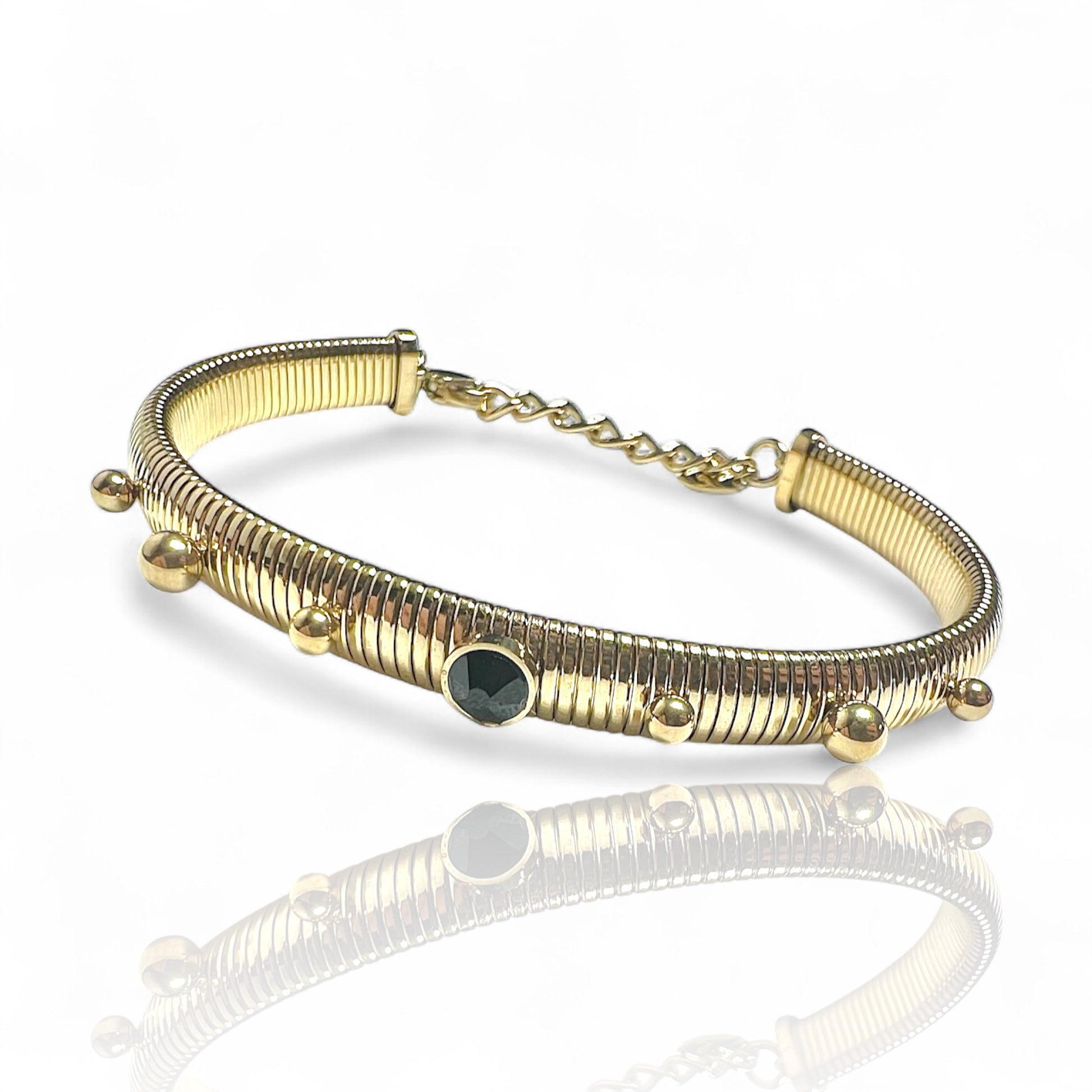 Confectionné en acier inoxydable doré, ce bracelet semi rigide présente une finition striée subtile, rehaussée par des délicates boules dorées, et un strass noir en son centre, qui capte la lumière avec discrétion. Résistant à l’eau et hypoallergénique, il s’adresse à toutes celles qui recherchent un bijou à la fois élégant, moderne et facile à porter.