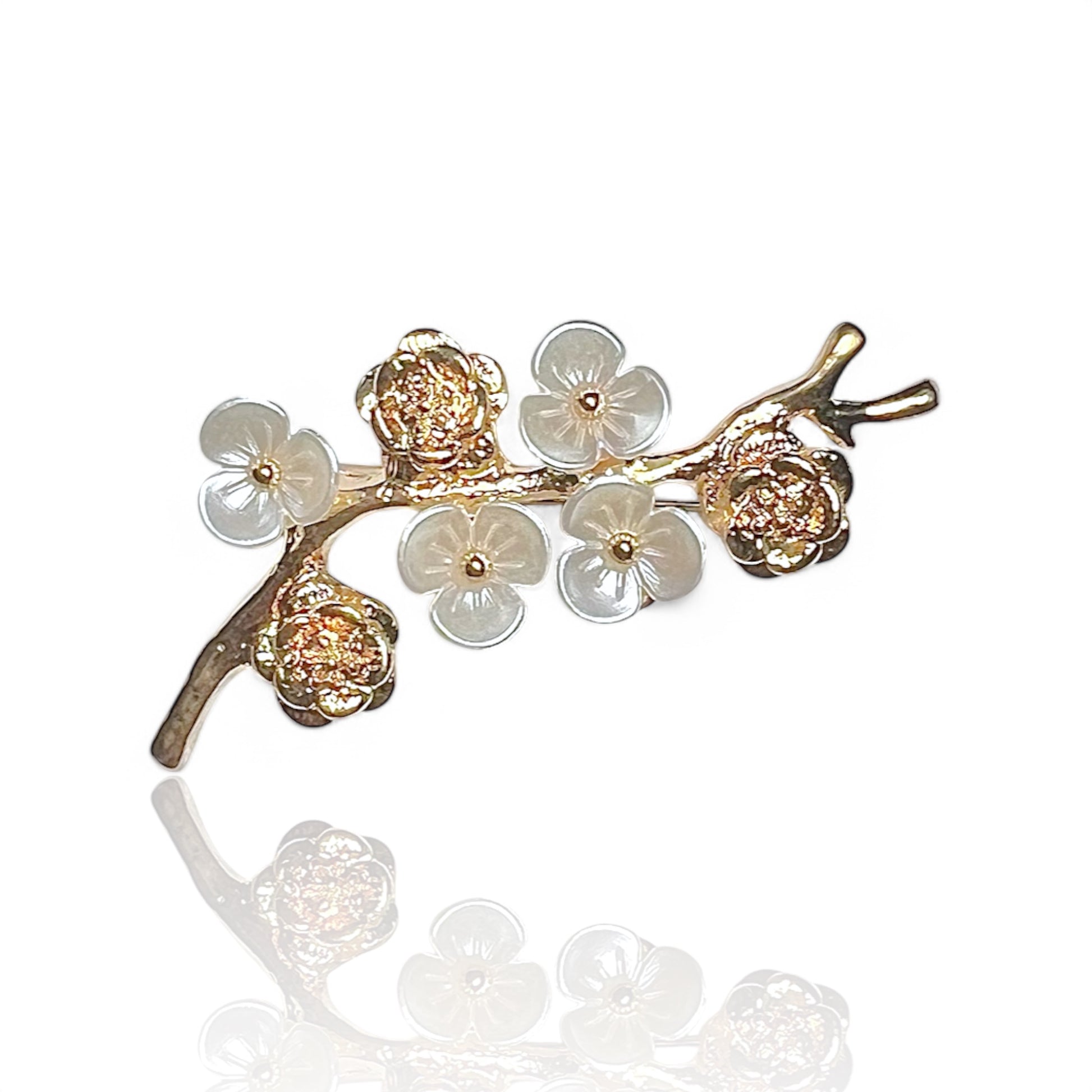 Ajoutez une touche de délicatesse et de poésie à votre style avec cette broche branche à fleurs. Un mariage harmonieux entre des fleurs dorées éclatantes et des fleurs blanches pures, qui en fait un accessoire fantaisie à la fois romantique et sophistiqué.