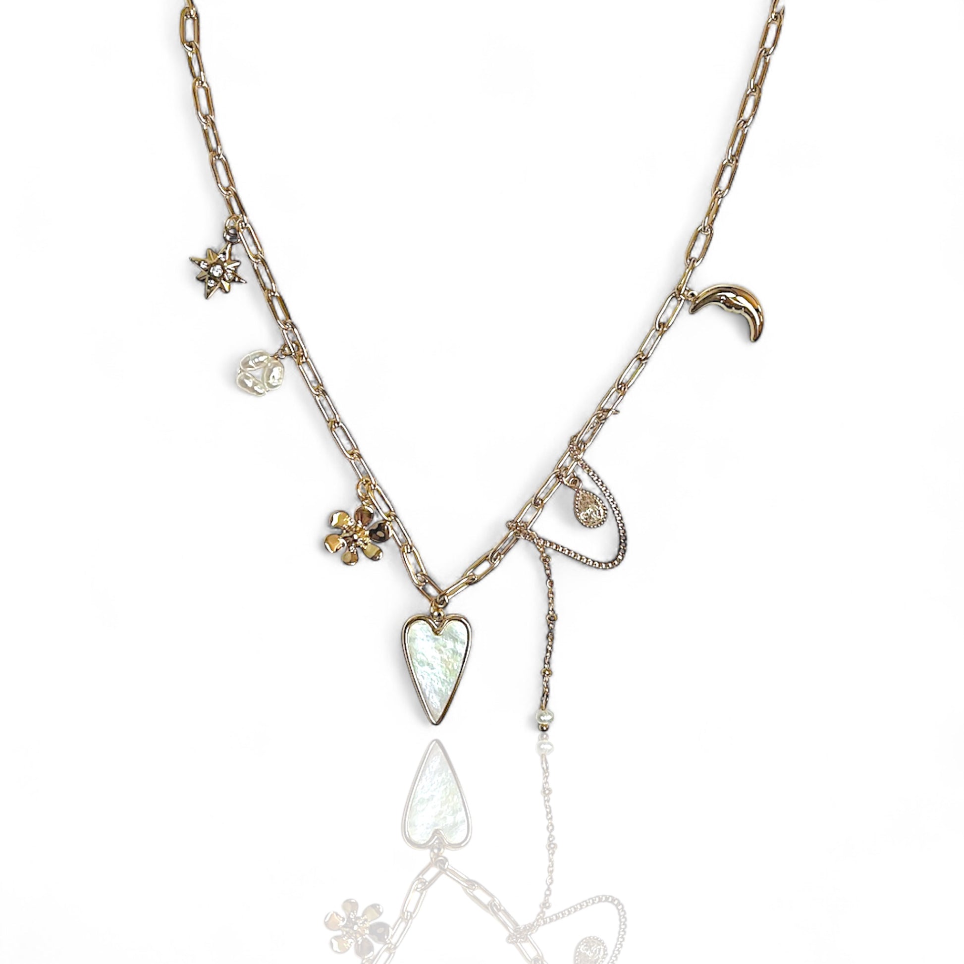 Poétique et féminin, ce collier fantaisie doré signé Bohm est une véritable invitation au rêve. Fabriqué en acier inoxydable doré, il est orné de 7 breloques délicates et symboliques : une étoile décorée d’un strass étincelant, une breloque ornée de trois perles d’eau douce blanches, une fleur stylisée, un cœur doré et nacré, une chaînette décorée d'une perle d’eau douce, une goutte dorée, et une lune discrète.
