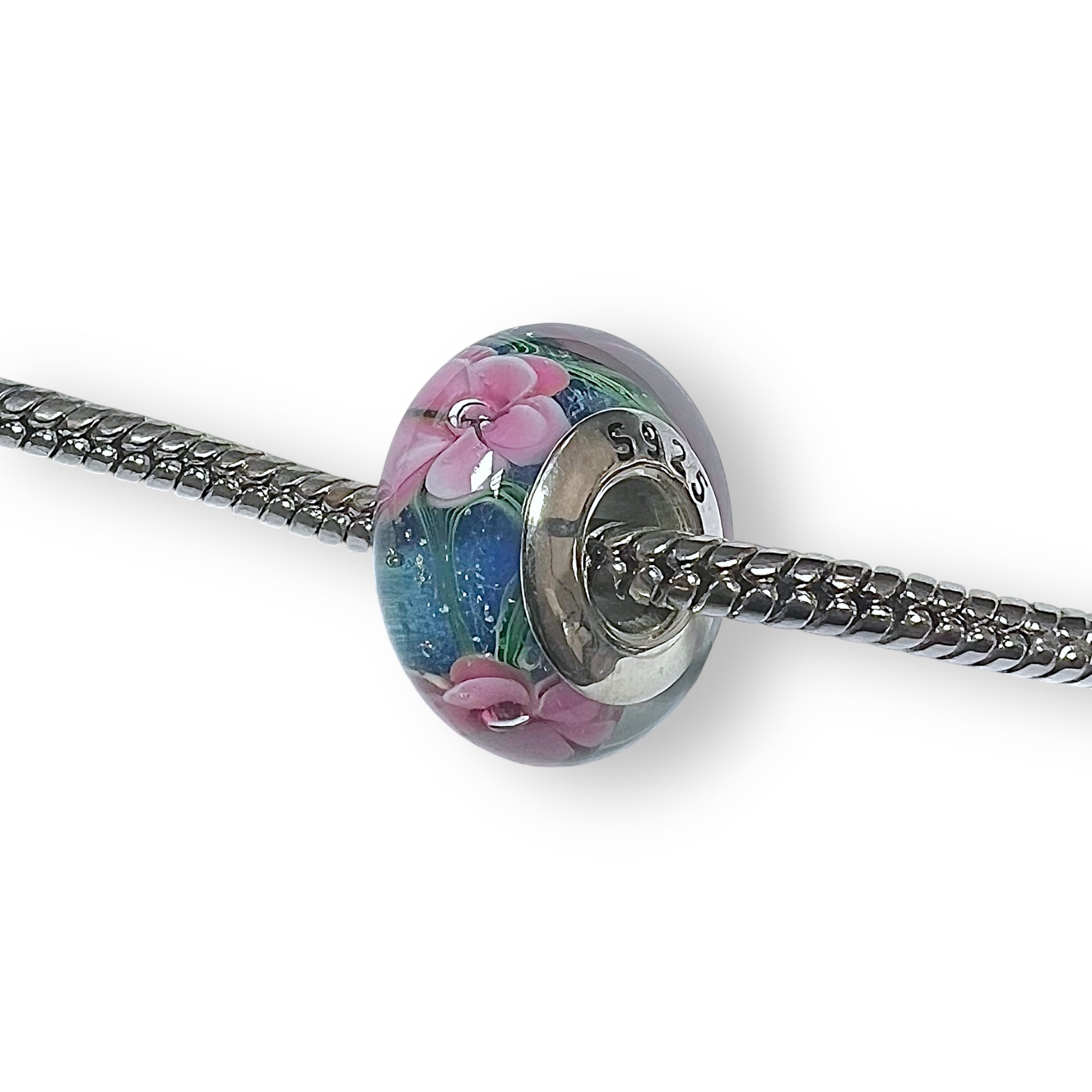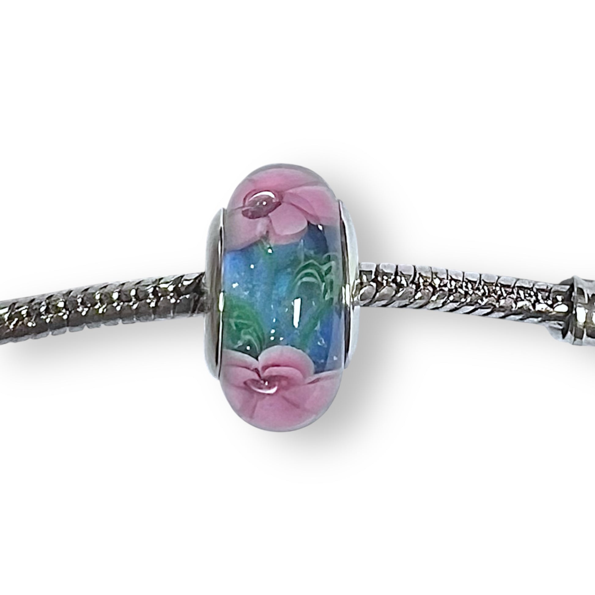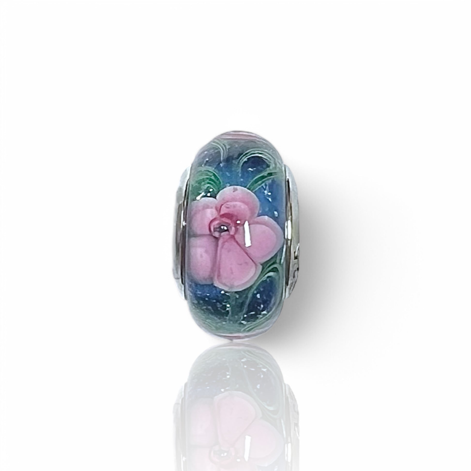 Ajoutez une touche d’élégance à votre bracelet avec cette magnifique perle en verre façon Murano, fabriquée avec un souci du détail exceptionnel. Son fond bleu intense est délicatement décoré de fleurs roses et de subtils motifs verts, offrant un design raffiné et intemporel.