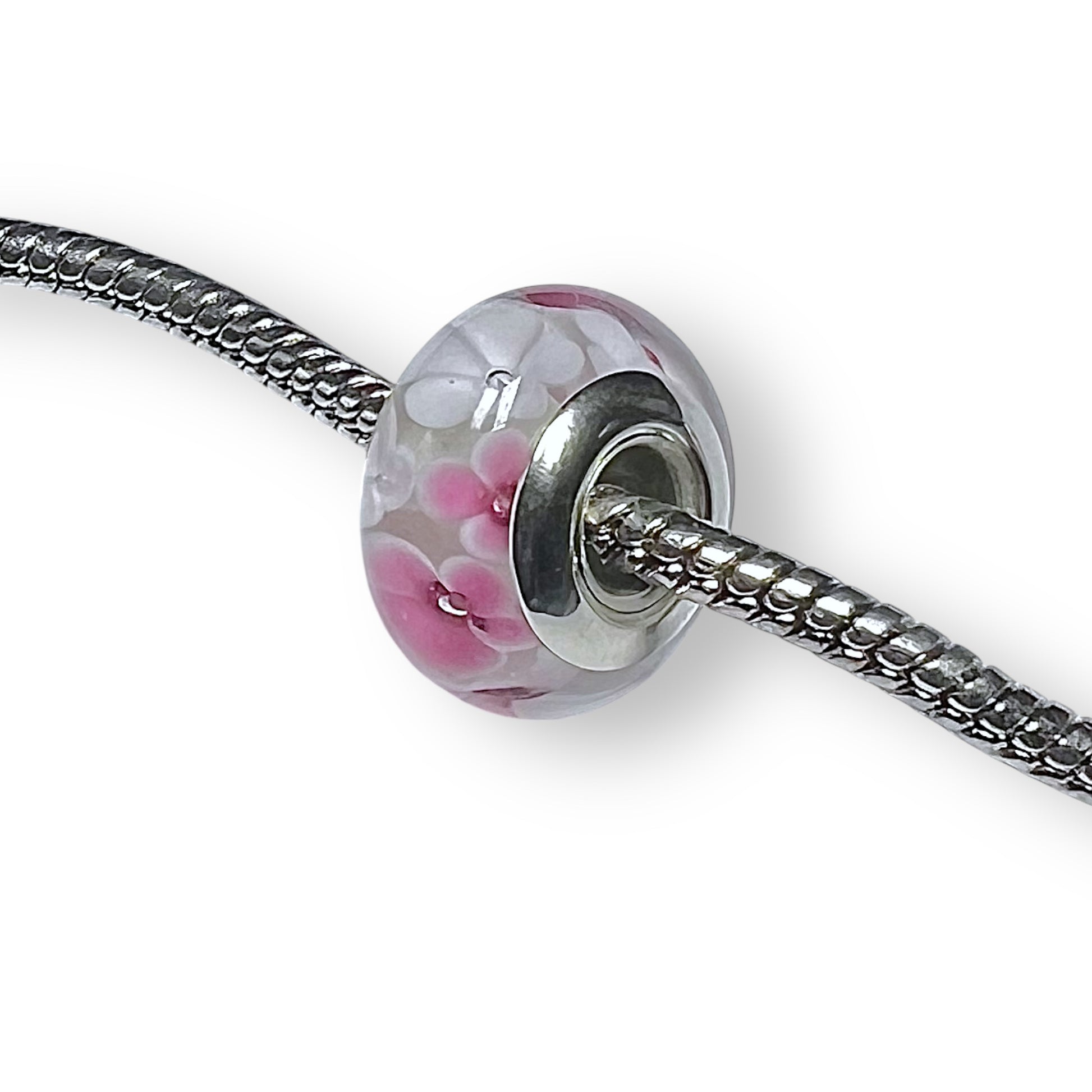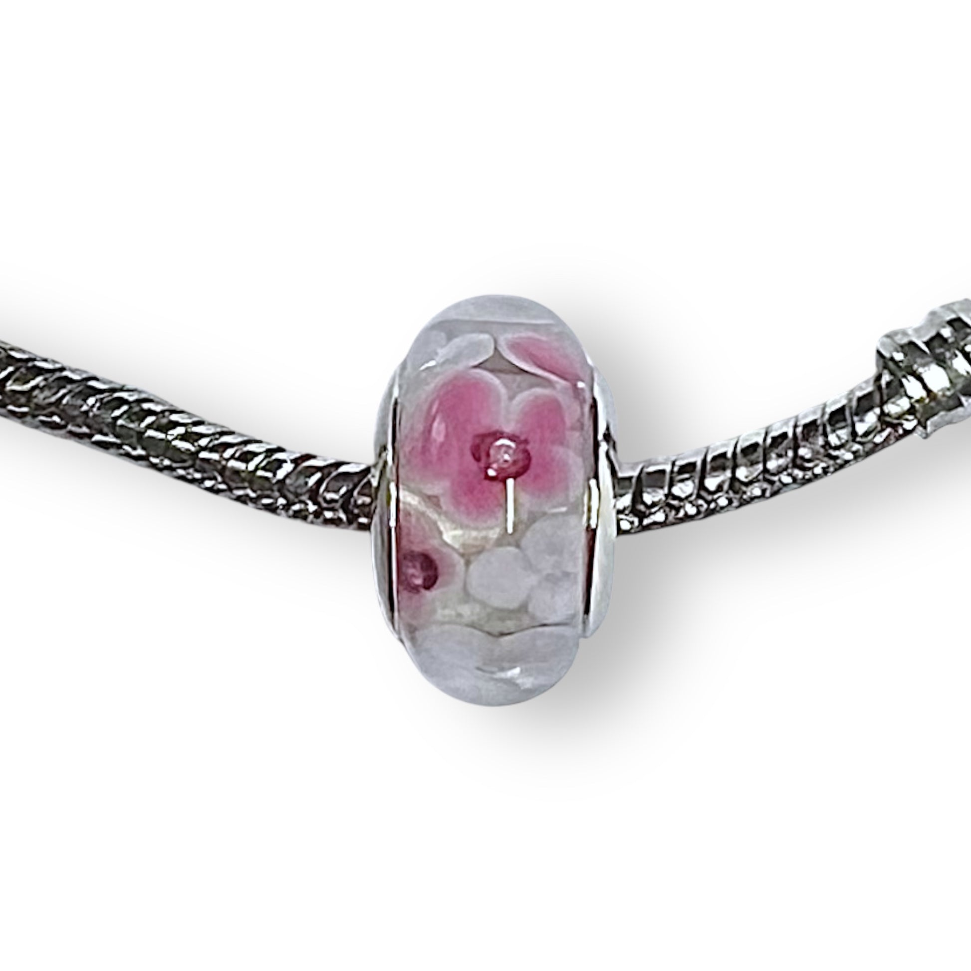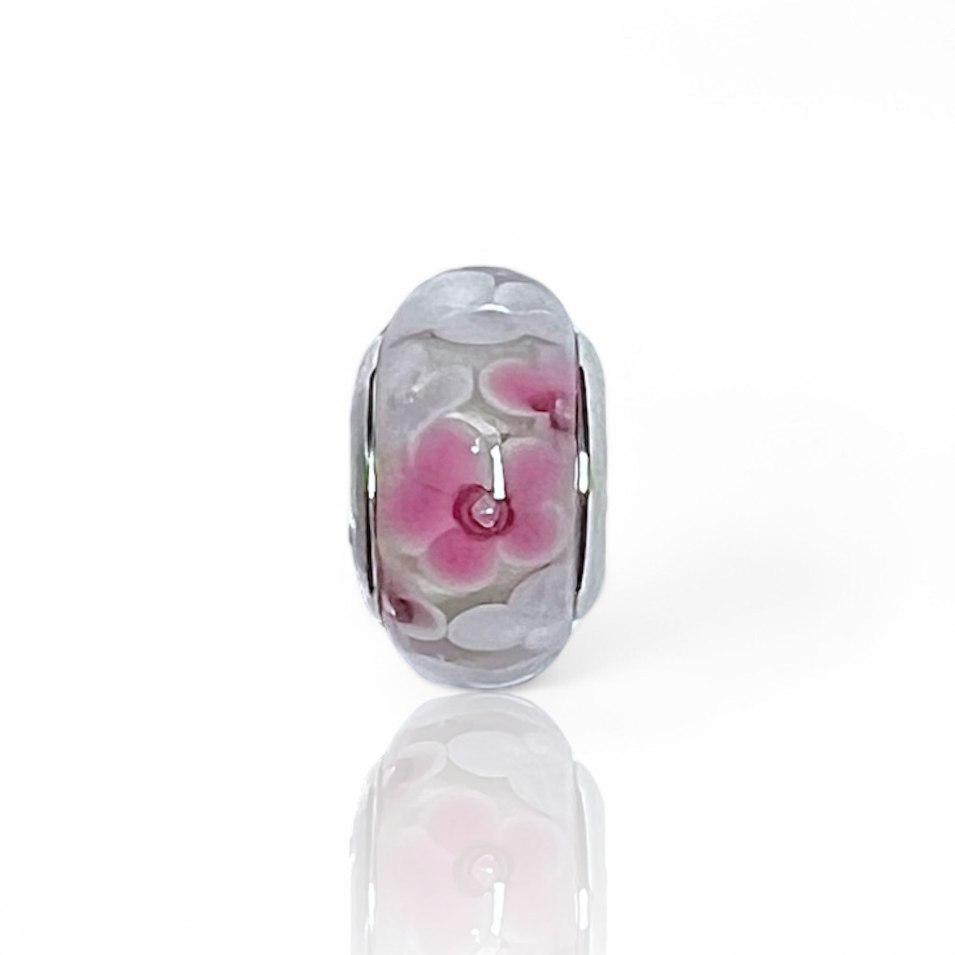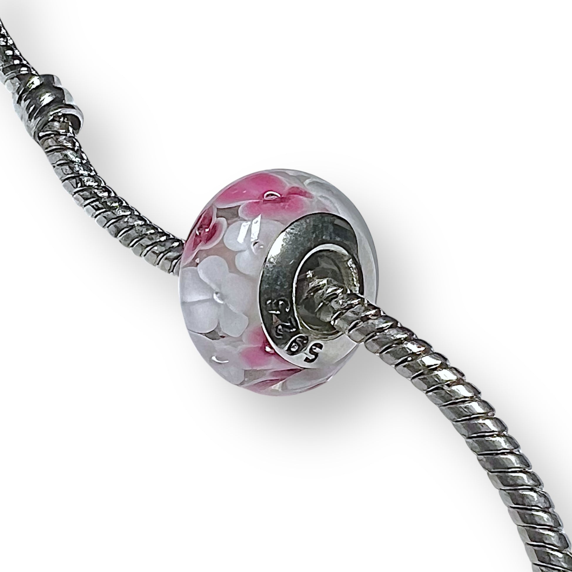 Apportez une touche de douceur et d’élégance à votre bracelet charms avec cette magnifique perle en verre façon Murano. Son fond blanc lumineux, sublimé par des motifs floraux délicats en blanc et rose, en fait un bijou raffiné et intemporel. Un véritable must-have pour les amateurs de charms en argent S925 et de bijoux fantaisie personnalisables.